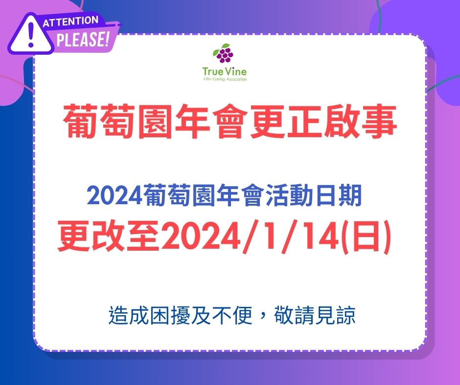 《重要通知》葡萄園年會更改至2024/1/14(日)